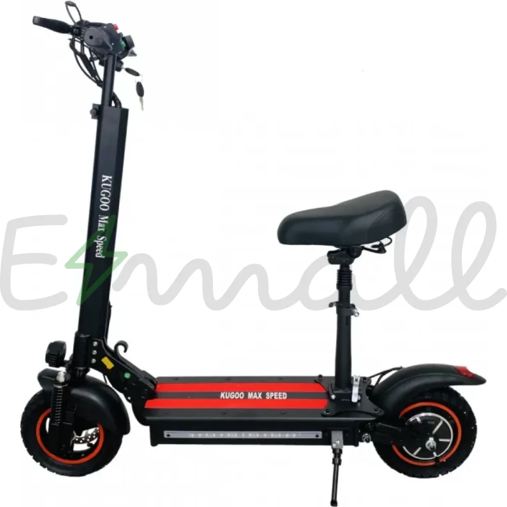 Самокат Kugoo Max Speed воплотил в себе все удачные детали от предыдущих моделей. Конструкция очень удобная, оборудована съемным сидением, руль и сидение можно подогнать по высоте, дека увеличилась в размерах, стала шире. На этой модели установлено заднее крыло нового типа, закрывает большую часть колеса, крепится непосредственно к деке.