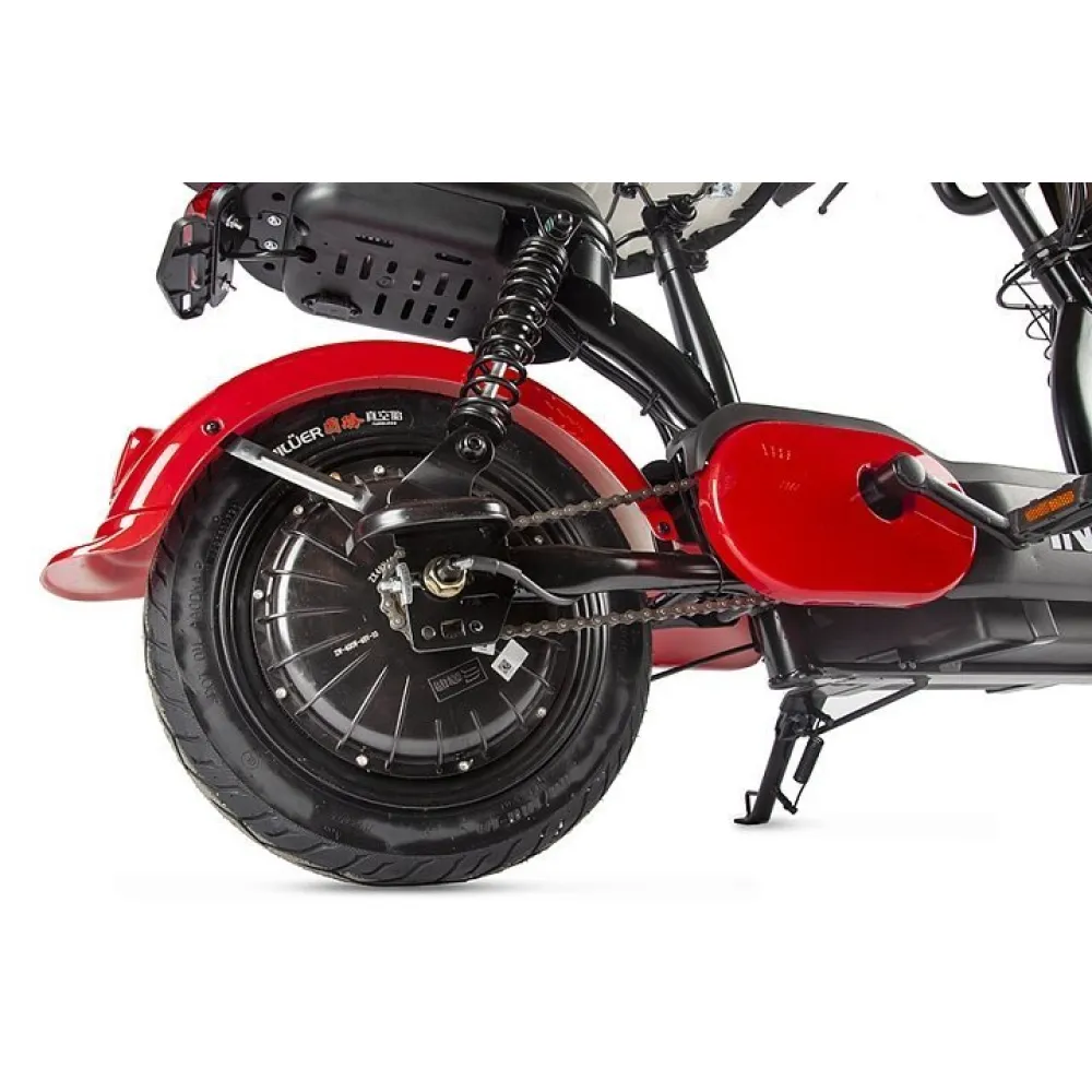 При грузоподъемности 150 кг техника готова разнообразить жизнь двух пользователей: водителя и пассажира. Первое сиденье представлено компактными эргономичными размерами, второе, имеет спинку, снимающую нагрузку с позвоночника, гарантирующую удобства при передвижении на разные расстояния.