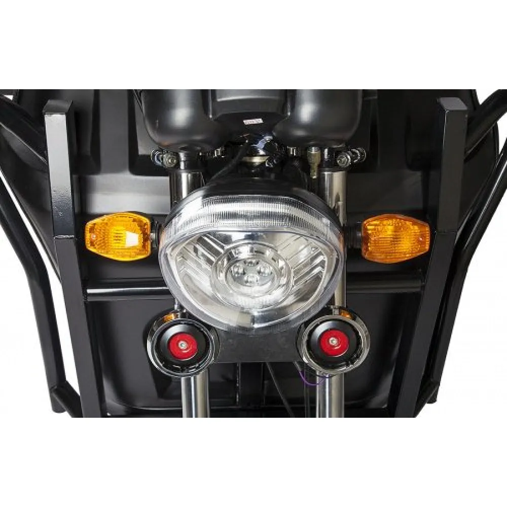 При мощности двигателя 1000 Вт суперэлектротрицикл способен развивать приличную скорость – до 35 км/час и преодолевать до 50 км пути. Емкая АКБ занаряжается сравнительно быстро.