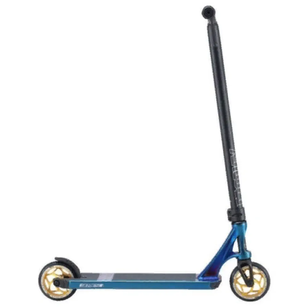 Самокат изготовлен из облегченного алюминия, весит 3,48 кг, долговечный в эксплуатации. Технические характеристики позволяют выполнять сложные трюки, прыжки, в том числе и с кручением. Нескользящая дека – широкая и устойчивая, исключает случайные падения и другие непредвиденные действия со стороны трюкача.