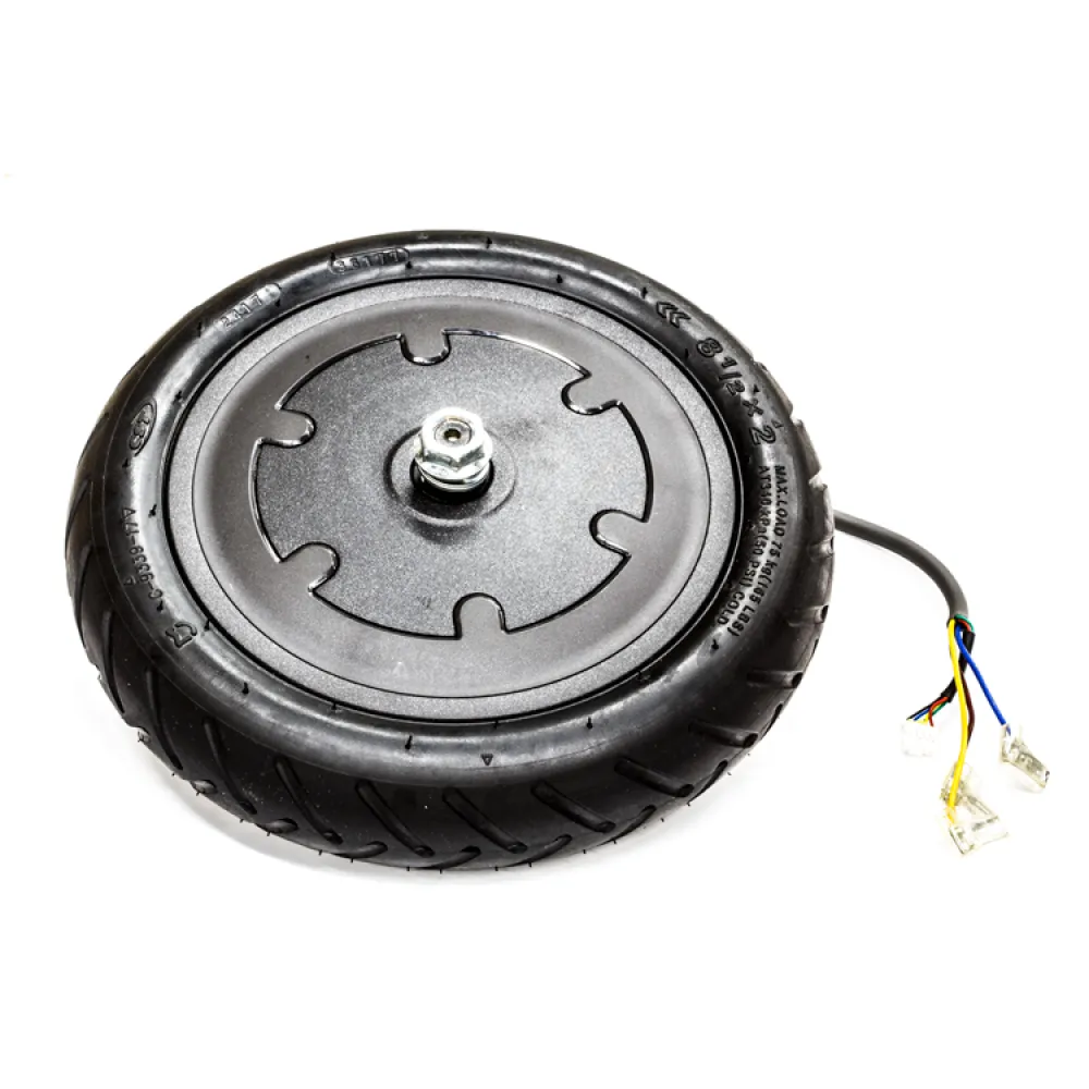 Мотор-колесо для электросамоката Xiaomi MiJia M365 имеет мощность 250 Вт. Скорость, которую может развивать при этом транспортное средство 25 км/ч, может преодолевать не значительные подъемы. Оно подсоединяется к самокату с помощью проводов с разъемами. Укомплектовано покрышкой с протектором, предназначенным для передвижения по асфальтированным и тротуарным дорогам.